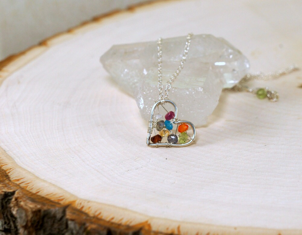 Show all the beauty in your heart with this joy-filled necklace. Nothing says happiness like this delicately hand wrapped heart. Each semiprecious stone is individually hand wrapped with either 14K Gold Filled or Sterling Silver Wire onto a 14K Gold-Filled or Sterling Silver Heart frame, then added to a chain in coordinating materials. Your heart will include variations of Carnelian, Peridot, Iolite, Garnet, Citrine, Neon Apatite, Labradorite, Moonstone and Pink Tourmaline. The chain is finished with gemstones that match one of the stones from the Heart at the closure and end of the two inch extension. Stones: Variations of Carnelian, Peridot, Iolite, Garnet, Citrine, Neon Apatite, Labradorite, Moonstone and Pink Tourmaline Materials: 14K Gold Fill or Sterling Silver Length: 16" with 2" extension Heart: Height - 9/16", Width - 5/8" Each necklace is placed on a presentation card inside an elegant chocolate-brown box. **Our pieces are all made by hand and show the individual characteristics and trademarks of an artisan, such an individually matching each stone grouping, balancing and finishing of all hand wrapping with wire, and of course, any individual requests as per the customer.